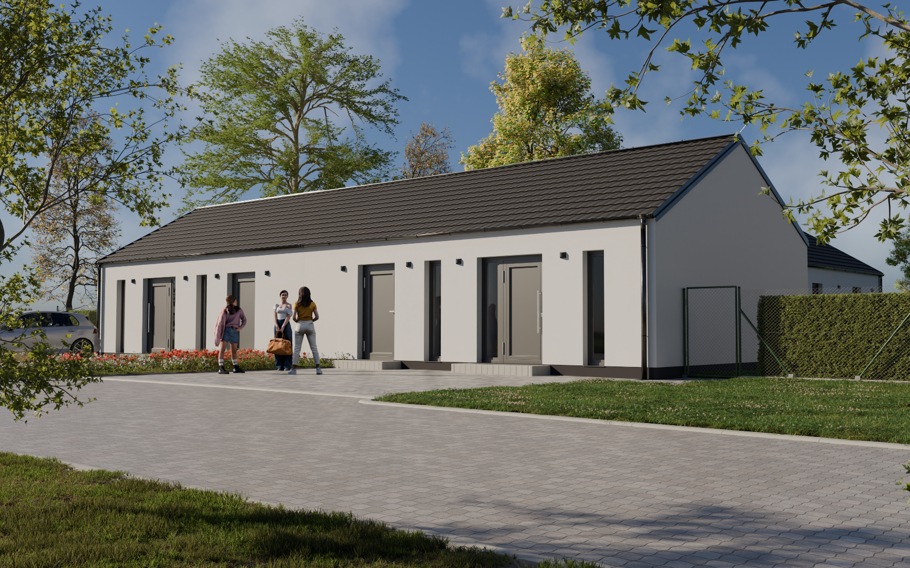 Rodinný dům Andrea je navržen jako bungalov ve tvaru písmene L a díky spojení se sousedním domem dokonale využívá potenciál pozemku. Najdete v něm vše potřebné pro pohodové a komfortní bydlení: hned u vstupu je šatna a WC a následuje velkorysá místnost spojující kuchyň s jídelnou a obývacím prostorem, ze které můžete vyjít přímo na terasu nebo pokračovat do druhé části domu. V té najdete ložnici, dva pokoje a další místnost, která může sloužit jako pracovna, všechny prostory s výhledem na zahradu. Nechybí tu ani šatna, dvě koupelny a WC.